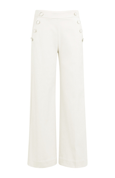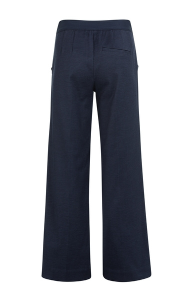 Deze stijlvolle broek met hoge taille is gemaakt van een zachte, soepelvallende stof en heeft een losse pasvorm. Het model heeft wijde pijpen en is afgewerkt met sierlijke knopen langs de zijkant voor een verfijnde touch. De elastische tailleband zorgt voor extra comfort. Voorzien van paspelzakken achter.
