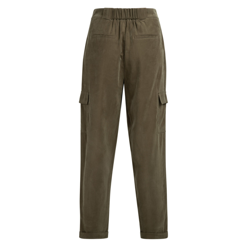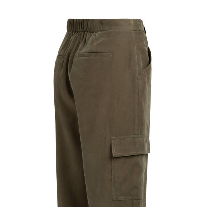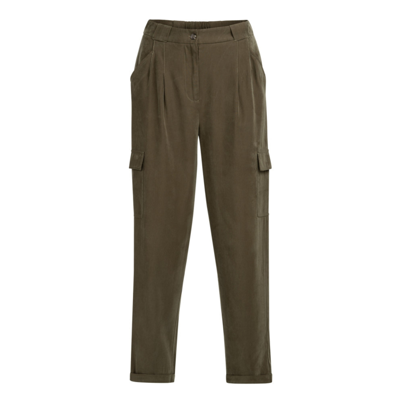 Deze comfortabele cargobroek is gemaakt van een zachte, soepelvallende geweven stof. Het model heeft rechte pijpen en plooien aan de voorkant voor een vrouwelijke touch, en is afgewerkt met cargozakken en omgeslagen zoom voor een casual uitstraling. De elastische tailleband achter zorgt voor extra comfort. Voorzien van steekzakken en paspelzakken achter.