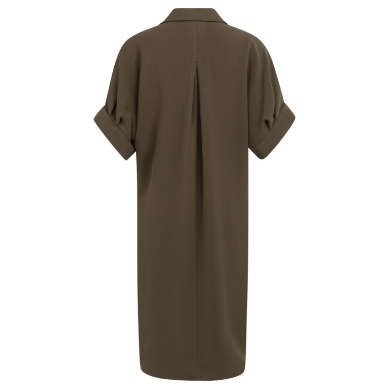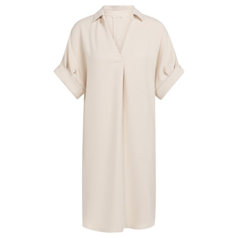 Deze elegante jurk heeft een V-hals, korte mouwen met subtiele plooidetails en een losse pasvorm. Het model valt lang en recht, wat zorgt voor een comfortabele en flatterende uitstraling. De minimalistische afwerking en zachte valling geven de jurk een verfijnde look. Een veelzijdig item dat je zowel casual als gekleed kan dragen.