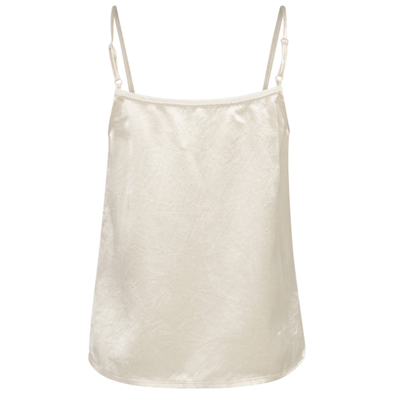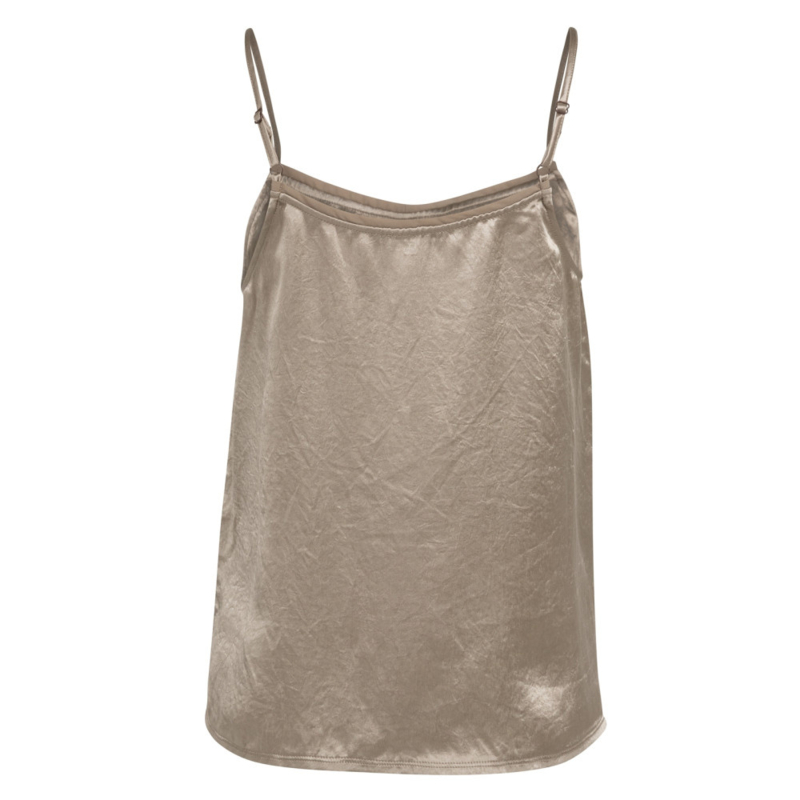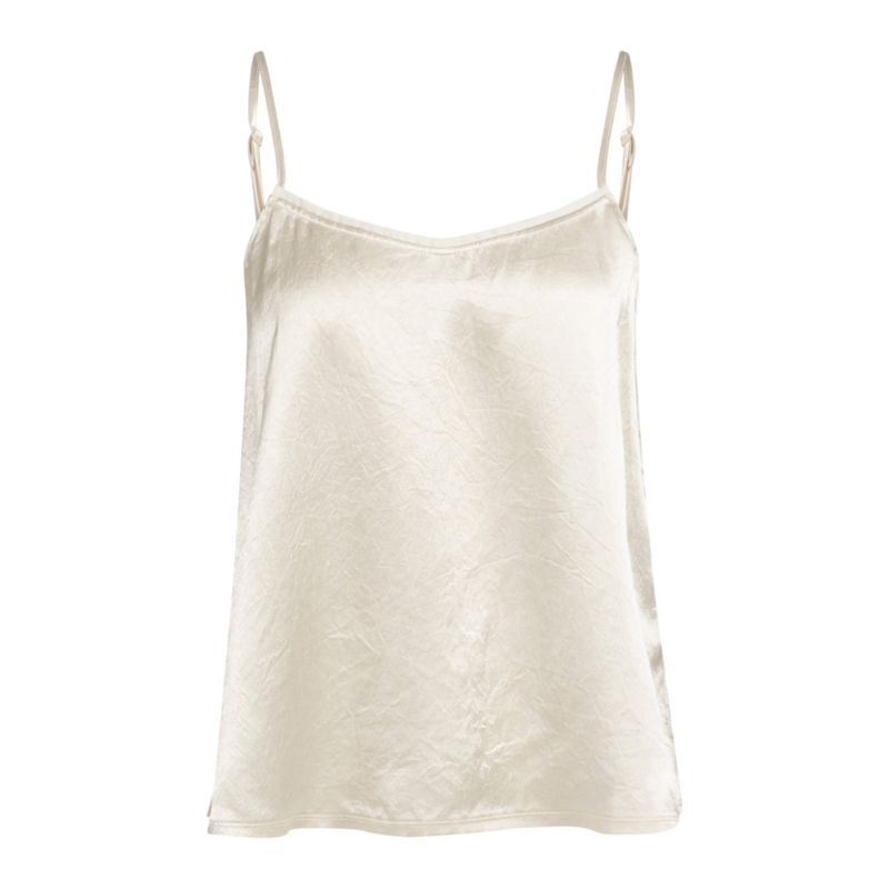 Deze elegante satijnen singlet heeft smalle, verstelbare schouderbandjes en een aangesloten, vrouwelijke pasvorm. De subtiele transparante afwerking langs de halslijn geeft het item een verfijnde en moderne uitstraling. De zacht glanzende stof valt soepel en maakt deze singlet perfect om zowel los te dragen als onder een blazer of vest.